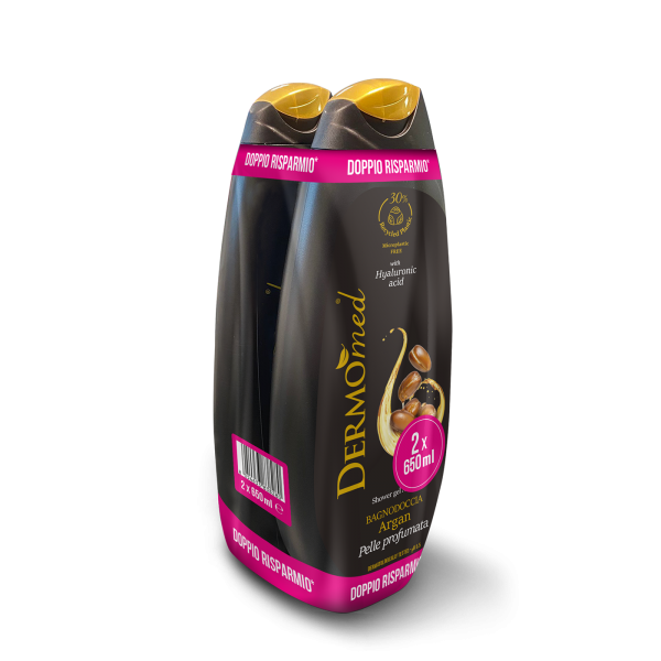 Dermomed Bagnodoccia Argan. Rispetta la pelle, anche quella più delicata, rendendola profumata, morbida e setosa. Con acido ialuronico, pH 5.5 e senza microplastiche. Dermatologicamente testato. -