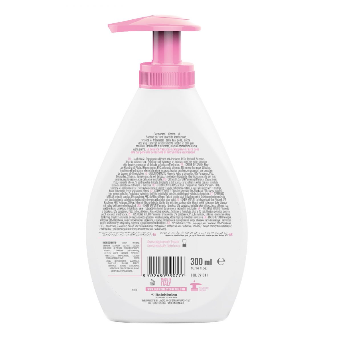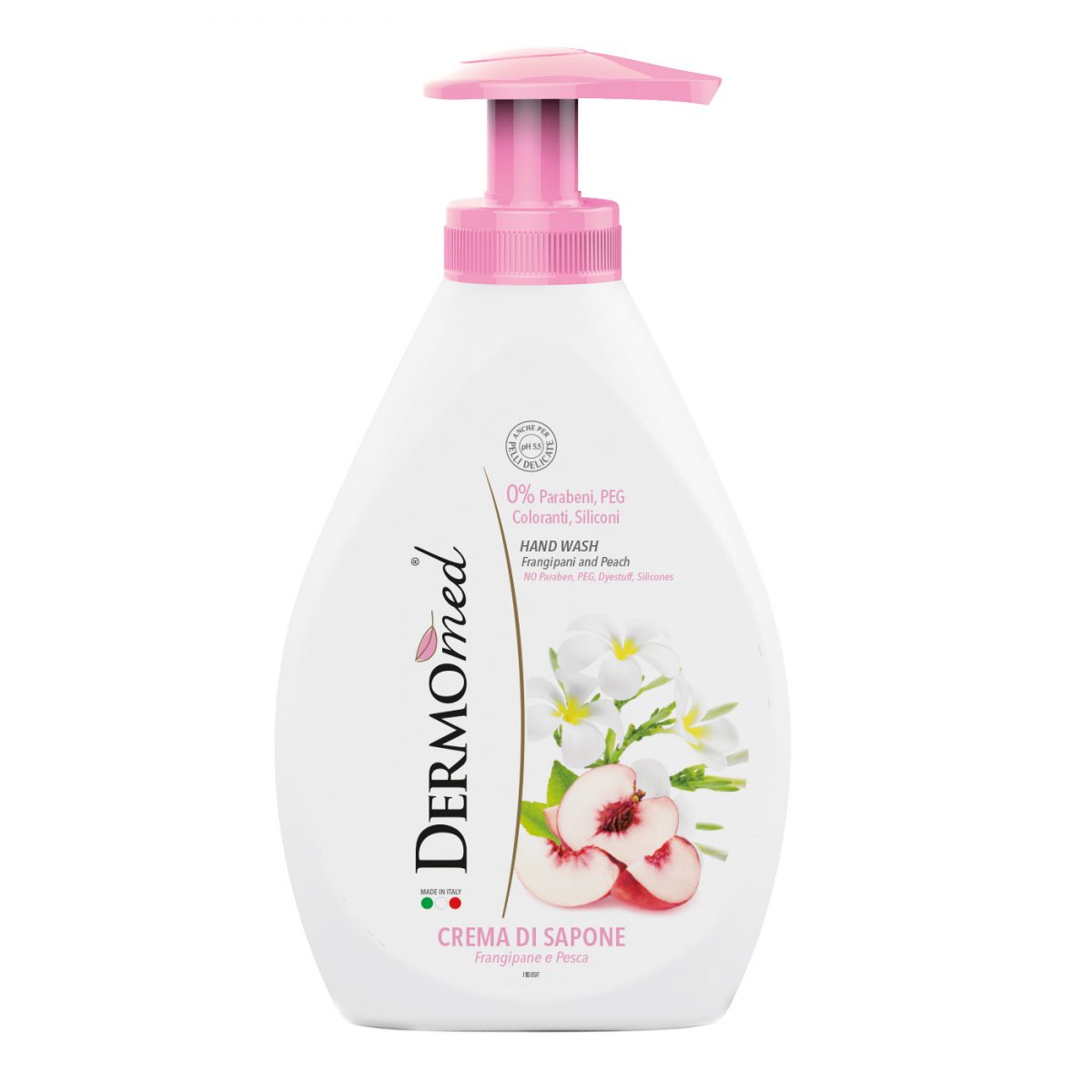 HAND WASH Frangipani & Peach. 0% Parabens, Dyestuff, Silicones. Emollient and hydrating, it cleanses even the most sensitive skin, leaving a delicate sensation of silken warmth.