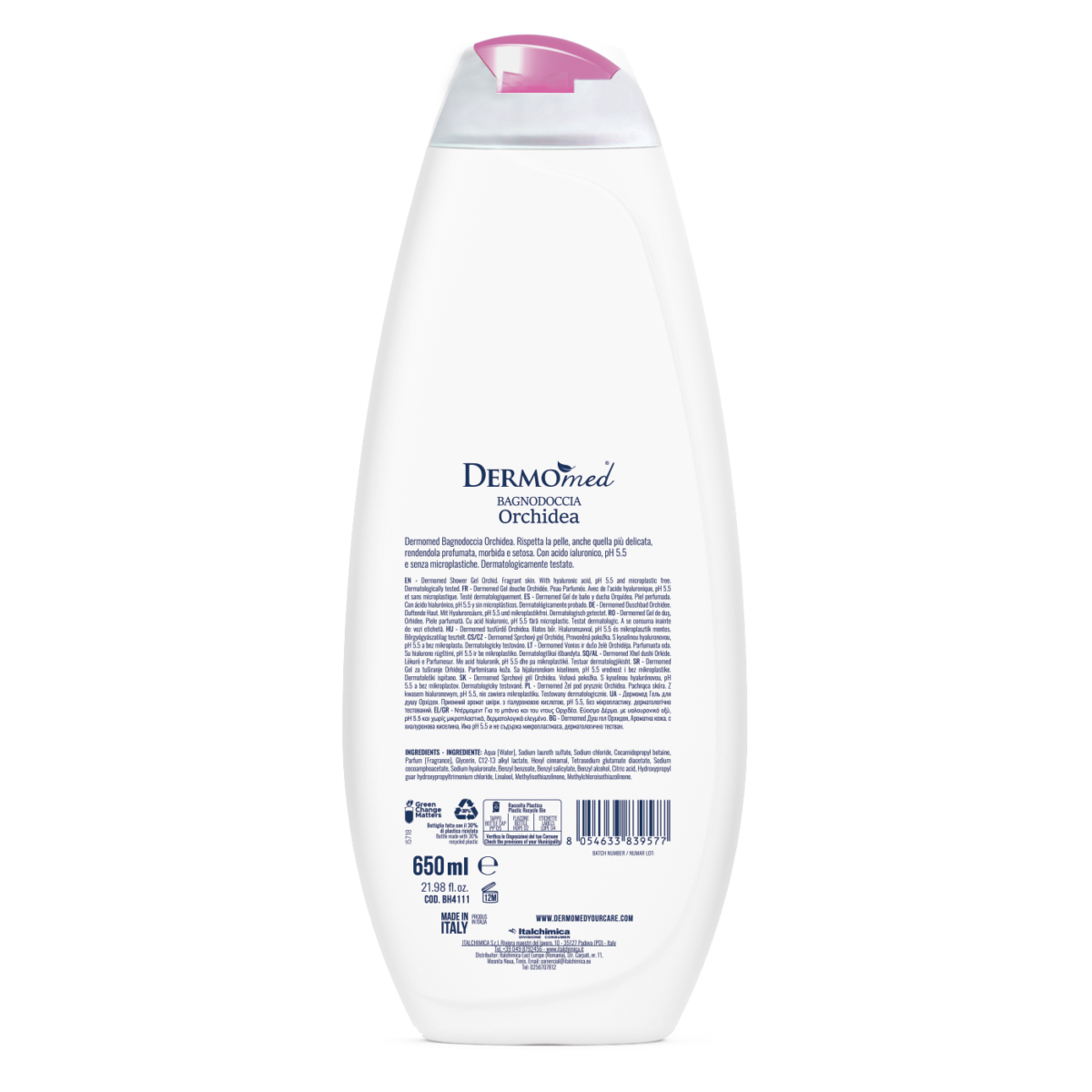 Dermomed Shower Gel Orchid. Fragrant skin. With hyaluronic acid, pH 5.5 and microplastic free. Dermatologically tested.
