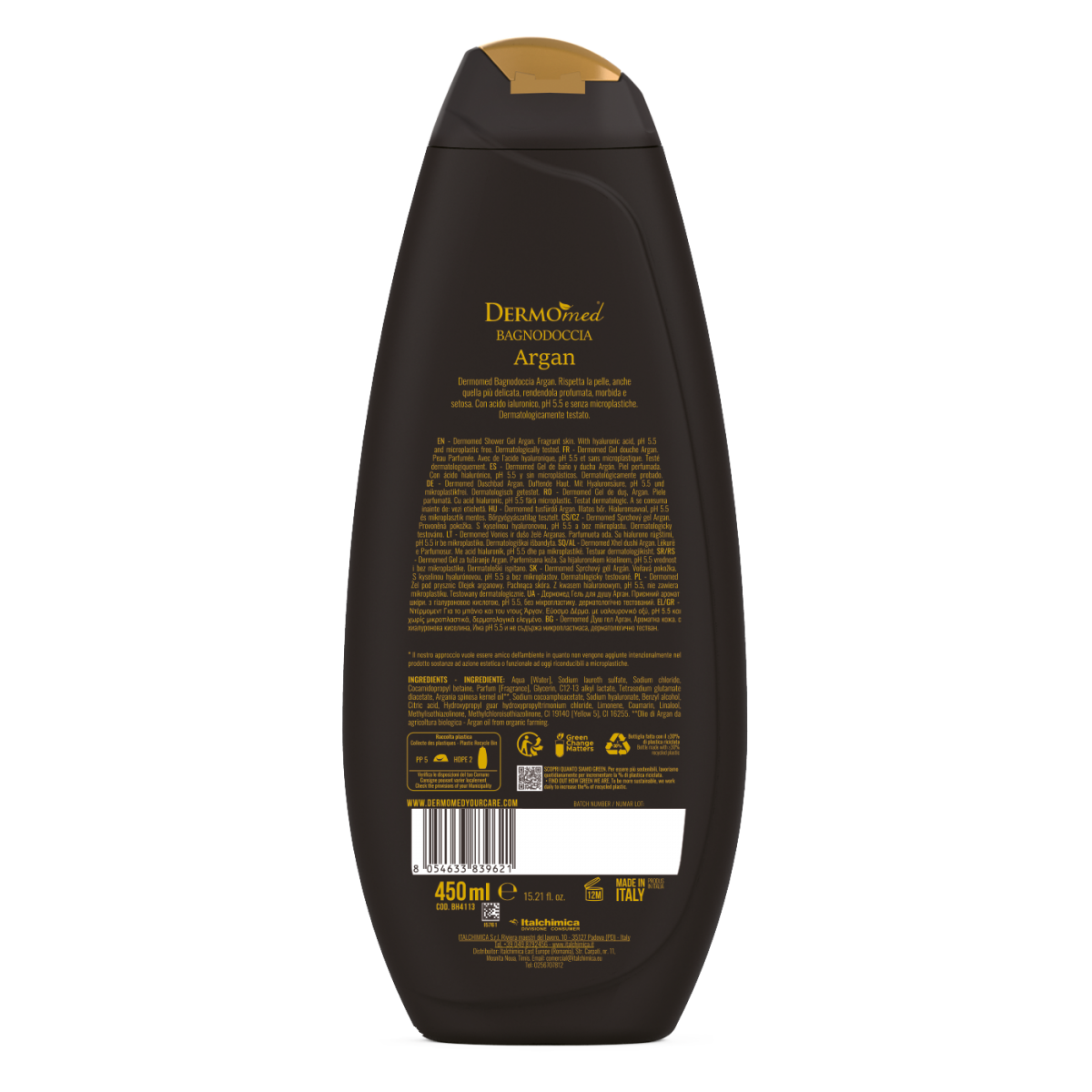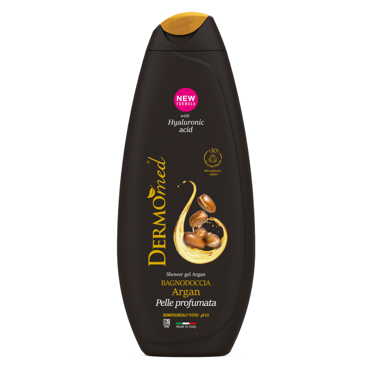 Dermomed Shower Gel Argan. Fragrant skin. With hyaluronic acid, pH 5.5 and microplastic free. Dermatologically tested.