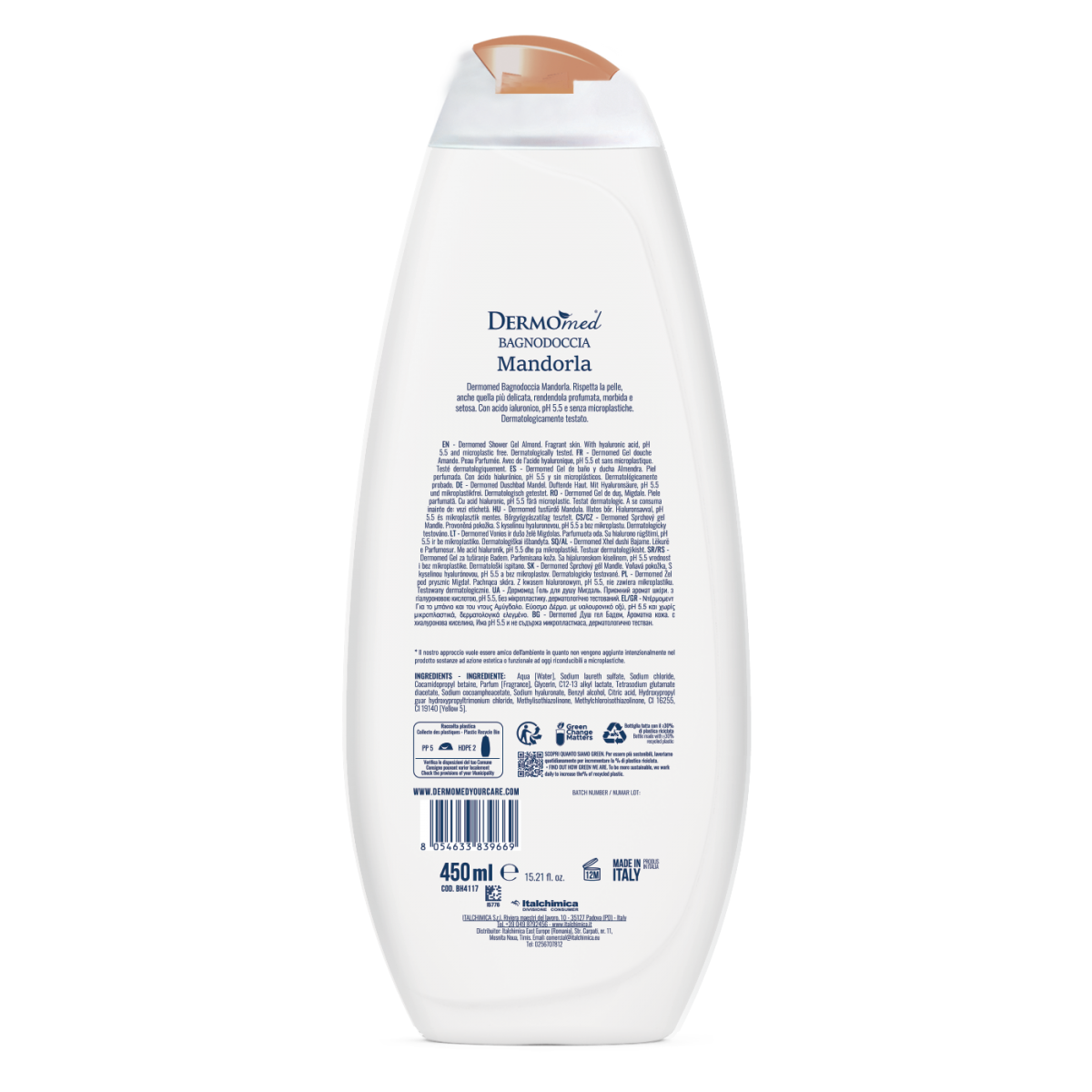 Dermomed Shower Gel Almond. Fragrant skin. With hyaluronic acid, pH 5.5 and microplastic free. Dermatologically tested.