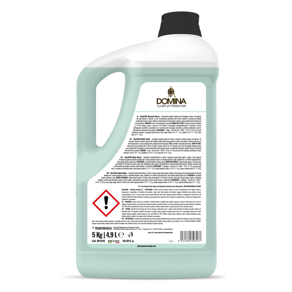 DOSING: 1 cap = circa 66 ml; 1 DOSE = 70 ml. 12-20 g per kg of dry washing, according to water hardness: Soft 0-15°F = 12 g; Medium 15-25°F = 15 g; Hard over 25°F = 20 g.