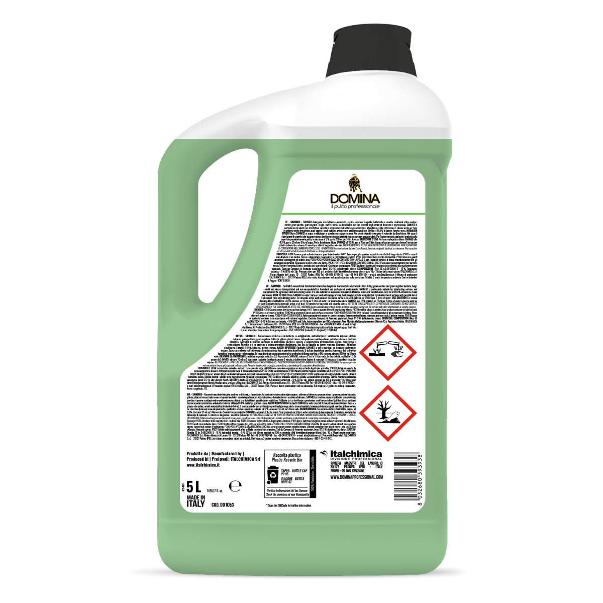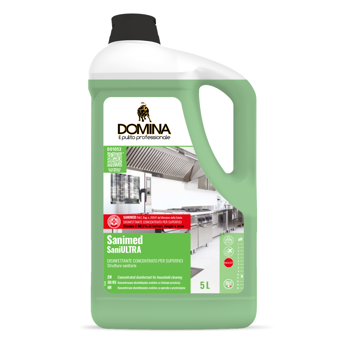 SANIMED detergente disinfettante concentrato, esplica un’azione fungicida, battericida e virucida, risultando attivo contro i batteri gram-positivi, gram-negativi, funghi, muffe e virus, sia incapsulati che non, presenti negli ambienti domestici e professionali. SANIMED è particolarmente adatto per disinfettare superfici e attrezzature del settore agro-alimentare, alberghiero e della ristorazione. È idoneo anche per l’uso in ambienti molto frequentati, quali bagni di locali pubblici, ambulatori e ambienti ospedalieri. Elimina il 99,9% di batteri, funghi e virus.
