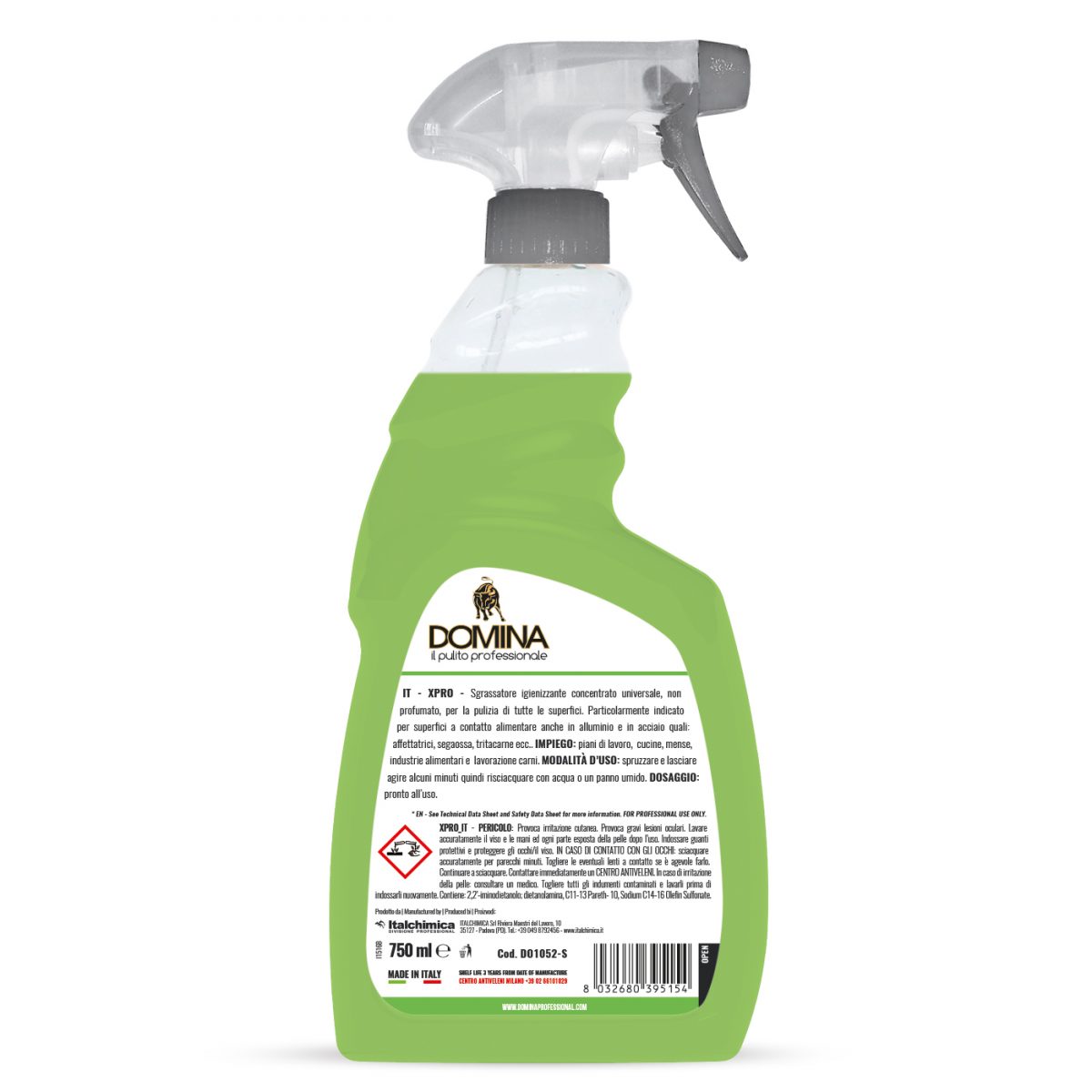 Sgrassatore Igienizzante concentrato universale, non profumato, per la pulizia di tutte le superfici. Particolarmente indicato per superfici a contatto alimentare anche in alluminio e in acciaio quali: affettatrici, segaossa, tritacarne ecc.