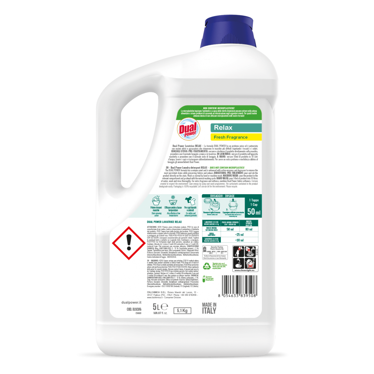 The DUAL POWER formula has a unique scent and is enhanced with active enzymes and degreaser to remove the most persistent stains while preserving fabrics and colours.