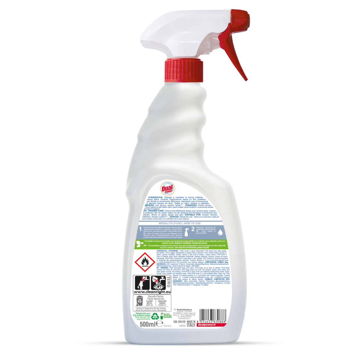 Cleans and shines showers. Leaves a protective film for easier water run-off, delaying formation of limescale and streaks. Works on glass, plastic and tiles.