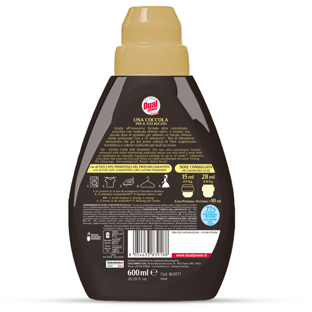 The new ultra-concentrated formula enhanced with odour-eliminating molecules means you only need a small dose of conditioner for intensely fragranced washing for up to 12 weeks in the wardrobe. Laboratory tests show that from the first use fibres are softer and plumper for easier ironing.