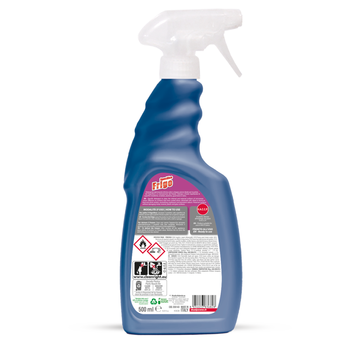 Dual action spray for cleaning and deodorising fridges and rapidly de-icing freezers. Cleans thoroughly without damaging metal and painted surfaces, plastics, seals and glass.