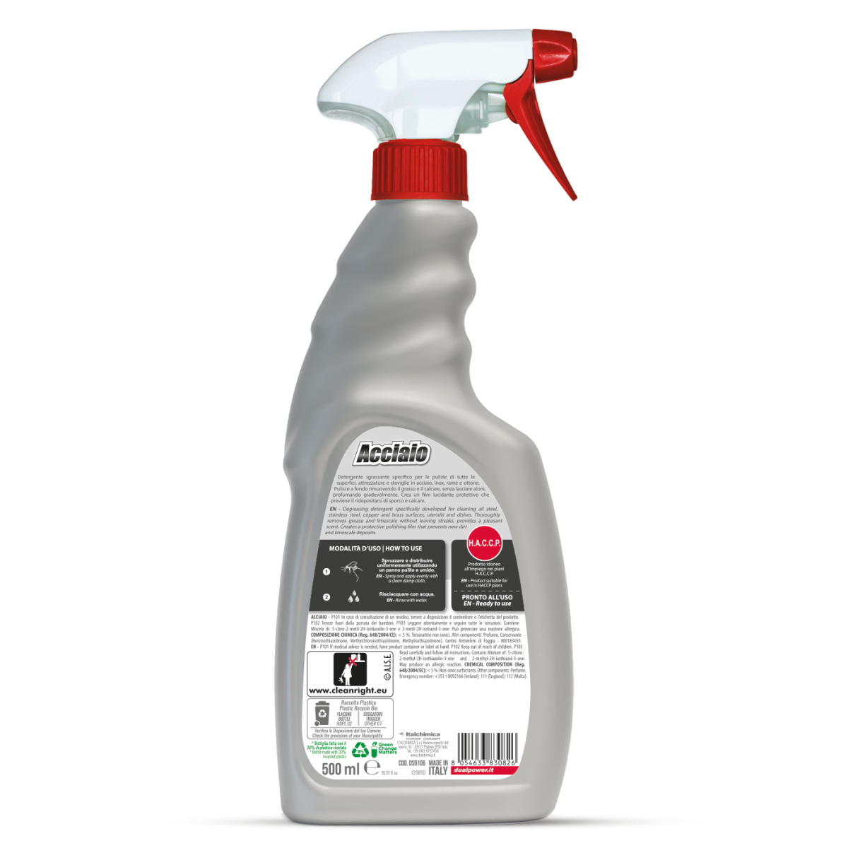 Degreasing detergent for cleaning all steel, stainless steel, copper and brass surfaces and equipment, including cooking equipment. Cleans deep down removing grease and limescale without streaks, leaving a pleasant fragrance. It creates a protective film which prevents new dirt and limescale build-up.