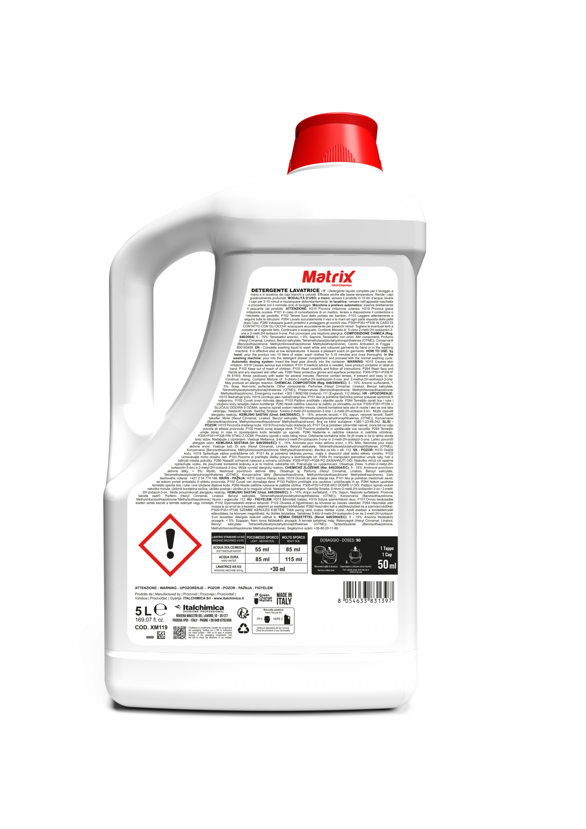 MOD DE UTILIZARE: Spălare manuală: turnaţi produsul în 10 litri de apă, spălaţi rufele timp de 5-10 minute şi clătiţi cu multă apă. În maşina de spălat: turnați produsul în compartimentul respectiv și efectuați ciclul de spălare normal. Maşini de spălat cu sistem de dozare automat: introduceţi tubul de aspiraţie direct în recipientul cu produs. DOZARE: 1 capac = circa 70 ml; 1 DOZĂ = 70 ml. 12-20 g pe kg de rufe uscate, în funcţie de duritatea apei: apă cu duritate mică 0-15 °f = 12 g; apă cu duritate medie 15-25 °f = 15 g; apă cu duritate mare 25 °f = 20 g.