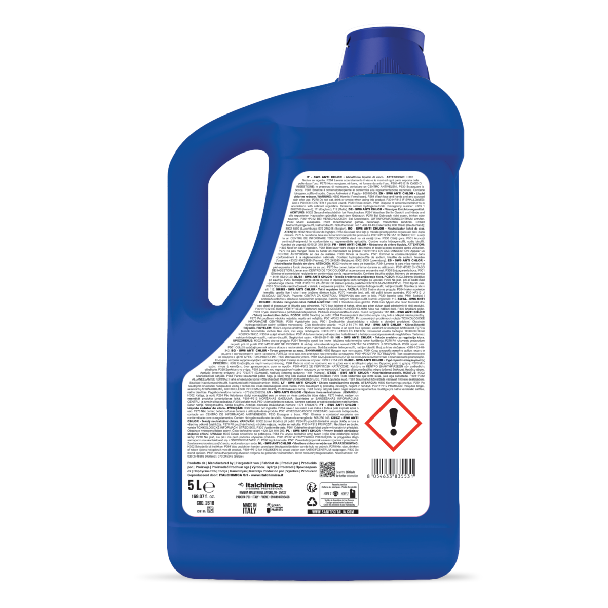 Dosaggio: 4-5 ml di prodotto per m3 d'acqua riduce il valore di cloro di circa 1 ppm.