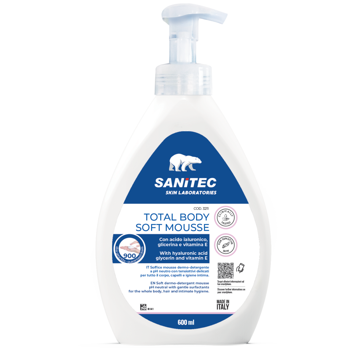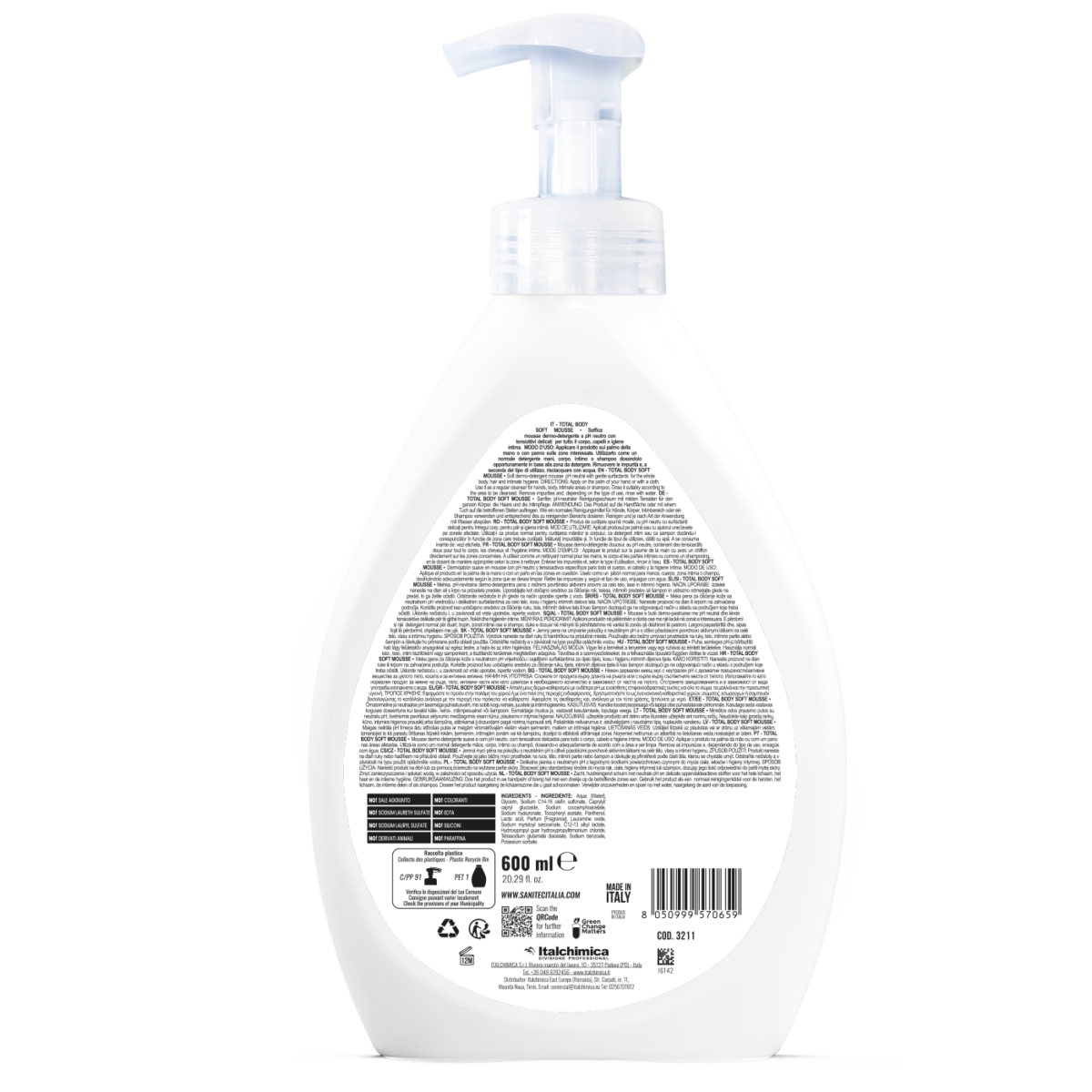 Soffice mousse dermo-detergente a pH neutro, con tensioattivi delicati per tutto il corpo, capelli, igiene intima