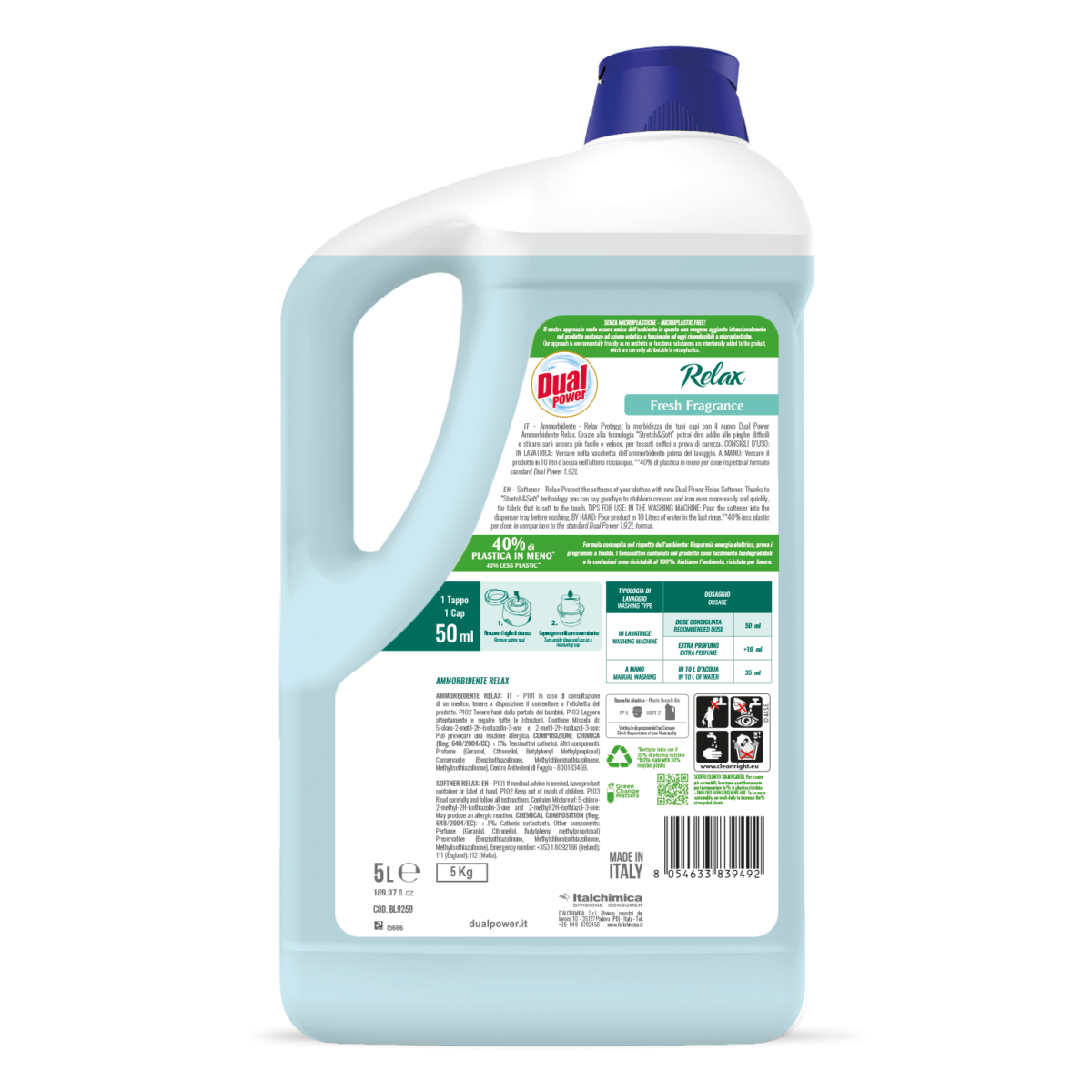 Protect the softness of your garments with Dual Power Relax Fabric Softener. Thanks to "Stretch&Soft" technology, you can say goodbye to difficult creases and ironing will be even easier and faster, for soft fabrics that are caress-proof.